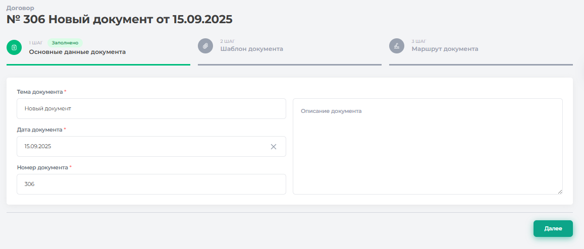 После выбора шаблона система открывает страницу ввода основных данных. В окне «Основные данные документа» (Рисунок 178) необходимо заполнить (обязательные поля отмечены * ):
