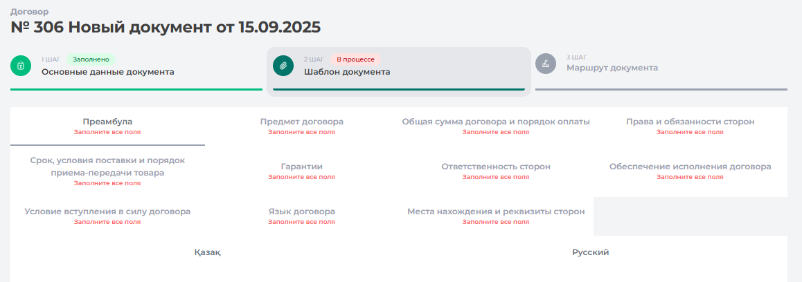 Во вкладке «Шаблоны документа» отображаются разделы, которые необходимо заполнить (Рисунок 179).