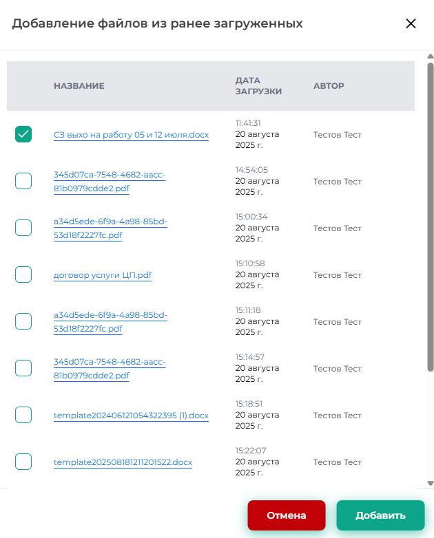 При нажатии на кнопку «Выбрать из ранее загруженных» система открывает модальное окно, где отображается список всех доступных документов (Рисунок 90). Вы можете отметить один или несколько файлов, после чего необходимо нажать кнопку «Добавить». Выбранные документы будут прикреплены к текущему документу и отобразятся в списке вложений.