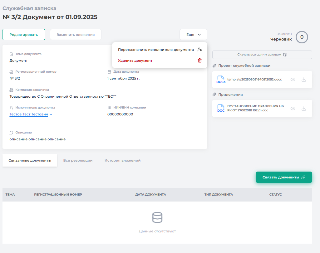 Дополнительно в карточке доступна функция «Скачать все одним архивом», которая позволяет скачать документ вместе с приложениями в одном архиве.