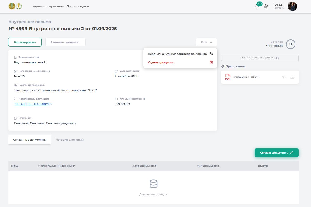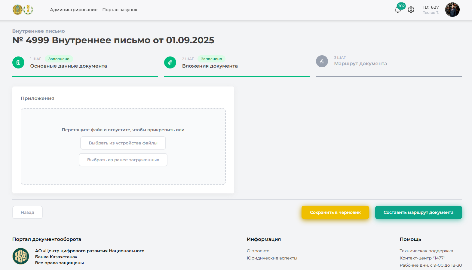 После заполнения данных и добавления вложений Вы можете нажать на кнопку «Сохранить в черновик». Система сохраняет введенные данные и формирует карточку документа (Рисунок 47).
