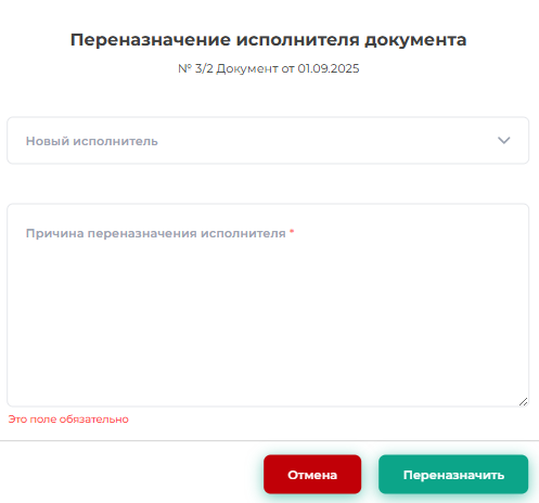 ● Переназначить исполнителя документа – при выборе этой опции открывается модальное окно, где необходимо указать нового исполнителя, выбрав его из выпадающего списка или осуществив поиск по ФИО либо электронной почте. Дополнительно требуется заполнить поле «Причина переназначения исполнителя» (не менее 20 символов). После заполнения данных необходимо нажать кнопку «Переназначить», чтобы изменения вступили в силу (Рисунок 48);