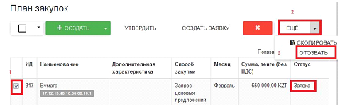 Система выдаст сообщение с текстом «Отозвано». Отозванный пункт плана отобразится в плане закупок со статусом «Черновик»