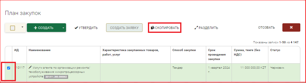 Создание пунктов плана возможно путем копирования существующих пунктов плана. Для копирования ранее созданного пункта плана необходимо отметить галочкой копируемый пункт плана, затем выбрать функцию «Скопировать»
