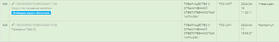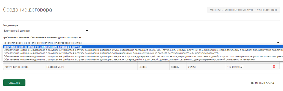 Информация о необходимости возврата обеспечения исполнения договора или обеспечения тендерной заявки отображается на странице «Договоры» у Заказчика/Организатора