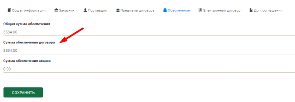 При выборе Автором договора строки «требуется обеспечение исполнения договора», в поле «Обеспечение исполнения договора» карточки договора отображается сумма в размере 3% от суммы договора