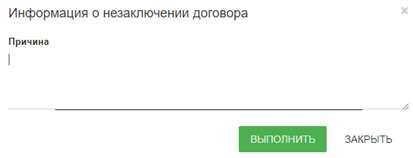 После введения причины необходимо нажать на кнопку «Выполнить». При этом система отобразит сообщение «Ваш договор Не заключен» и статус договора автоматически перейдет на статус «Не заключен»