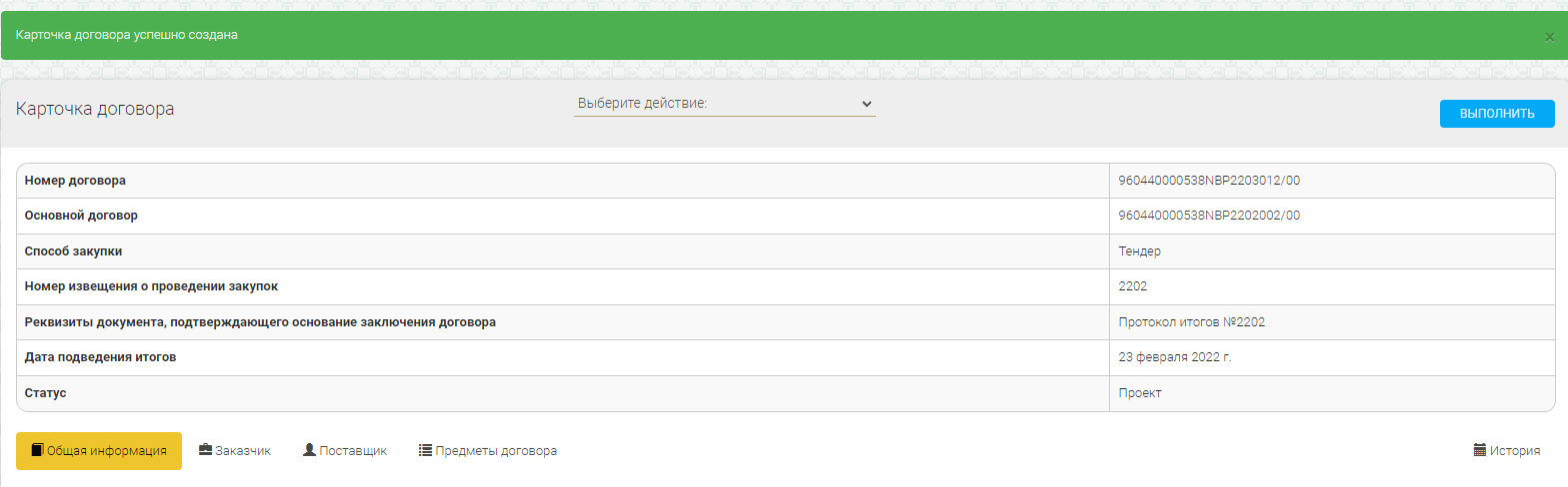 Далее создается новая карточка договора со 2-ым победителем