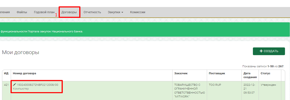 При необходимости Заказчик может изменить данные в полях «Внутренний номер договора» и «Планируемая дата исполнения». После изменения необходимо нажать на кнопку «Сохранить».