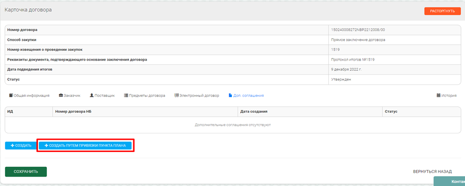 Создание карточки дополнительного соглашения путем привязки пункта плана способом «Создание дополнительного соглашения»