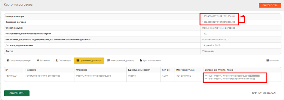 После создания дополнительного соглашения путем привязки пункта плана в подразделе «Предмет договора» отображается поле «Связанные пункты плана», где указывается основной пункт плана и дочерний.