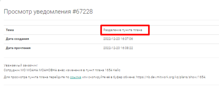 После разделения пункта плана сотрудникам организации с ролью Заказчик Портал отправляет системное уведомление «Разделение пункта плана».