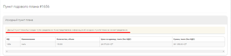- При удалении разделенного пункта плана данные («Количество, объем», «Цена за единицу, тенге (без НДС)» родительского пункта плана возвращаются в исходные.