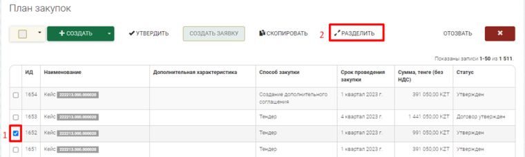 Для увеличения/уменьшения суммы договора за счет разбиения плановой суммы закупки/пункта плана Заказчик может разделить пункт плана в закупках способом «Тендер», «Запрос ценовых предложений» или «Прямое заключение договора». Для разделения пункта плана Заказчику необходимо отметить галочкой пункт плана со статусом «Утвержден» или «Итоги. Закупка не состоялась», далее нажать на кнопку «Разделить».
