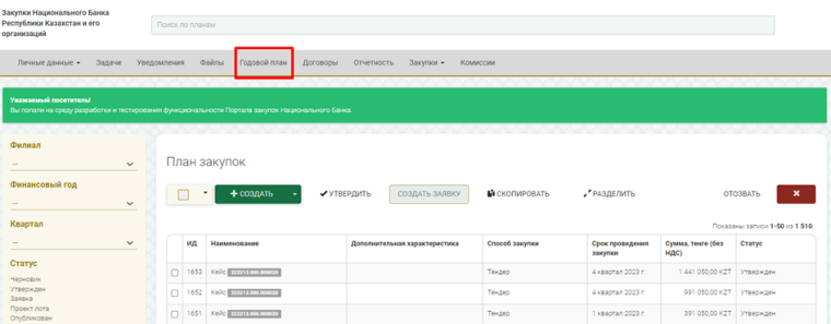 Для создания пункта плана Пользователю с ролью Заказчик необходимо перейти в раздел «Годовой план» на Портале закупок (далее-Портал).