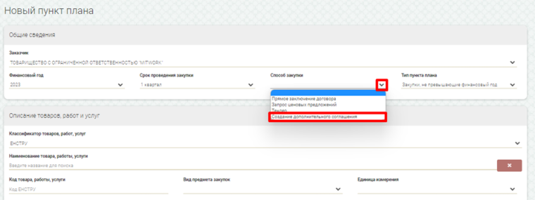 Создание пункта плана способом закупки "Создание дополнительного соглашения" из Годового плана