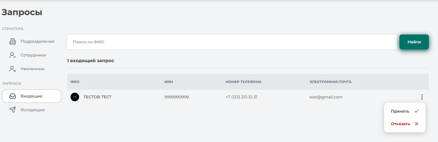 Входящие запросы – в этом разделе отображаются все сотрудники, которые направили запрос на присоединение к компании (Рисунок 38). Администратор компании может: