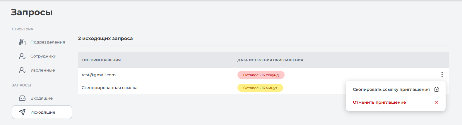 Исходящие запросы – в этом разделе отображаются приглашения, которые были отправлены сотрудникам для регистрации (Рисунок 39). Администратор компании может: