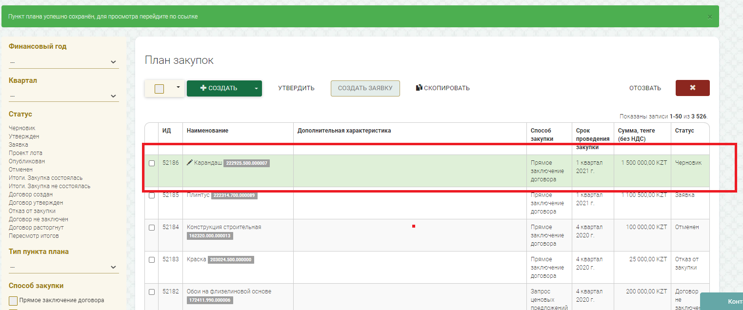 Создание пункта плана способом закупки "Создание дополнительного соглашения":
